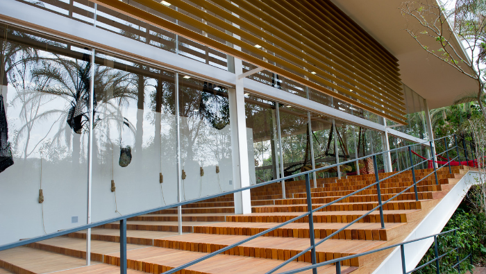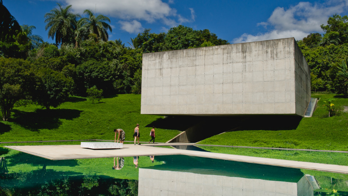 Na mesma rota da Galeria Cosmococa, encontramos a Galeria Adriana Varejão (G7), com formas que podem parecer rígidas, mas que permitem fluidez de percursos, já que pode ser visitada a partir do pavimento térreo e também pela cobertura do edifício. Em contraste com sua forma brutal e a materialidade em concreto armado, os espelhos d’água em formatos geométricos imprimem leveza e refletem a natureza que circunda o edifício. As aberturas também são zenitais e iluminam indiretamente as obras de arte de forma poética e sensível. Trata-se de mais um exemplo da integração entre arquitetura, arte e natureza no Instituto.