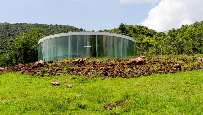 Passando pela rota rosa do mapa, subimos até a galeria Doug Aitken (G10), onde está o Sonic Pavillion (2009), popularmente conhecido como “O Som da Terra”. Esse projeto se destaca pela maneira como a construção trabalha a relação entre forma e função. Trata-se de um pavilhão, composto de vidro e aço, de formato circular, revestido por uma película plástica. Ao centro dele, um poço tubular com cerca de 200 metros de profundidade dotado de um sofisticado sistema de microfones que (pasmem!) amplifica o som da Terra em tempo real! Muitos visitantes escolhem contemplar o som em um banco de madeira que circunda o perímetro da galeria. O fato de se sentarem em forma de círculo, com o poço ao centro do espaço, traz o efeito sinestésico de apreciação sonora necessário para uma obra como esta. A experiência é transformadora!
